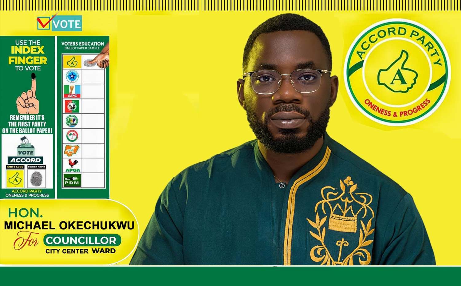 With the Accord Party’s ‘Thumbs Up’ logo and the motto “Oneness & Progress, Michael is calling for a unified front.We are the first on the ballot because we are the first choice for a modern Abuja, says a campaign coordinator.