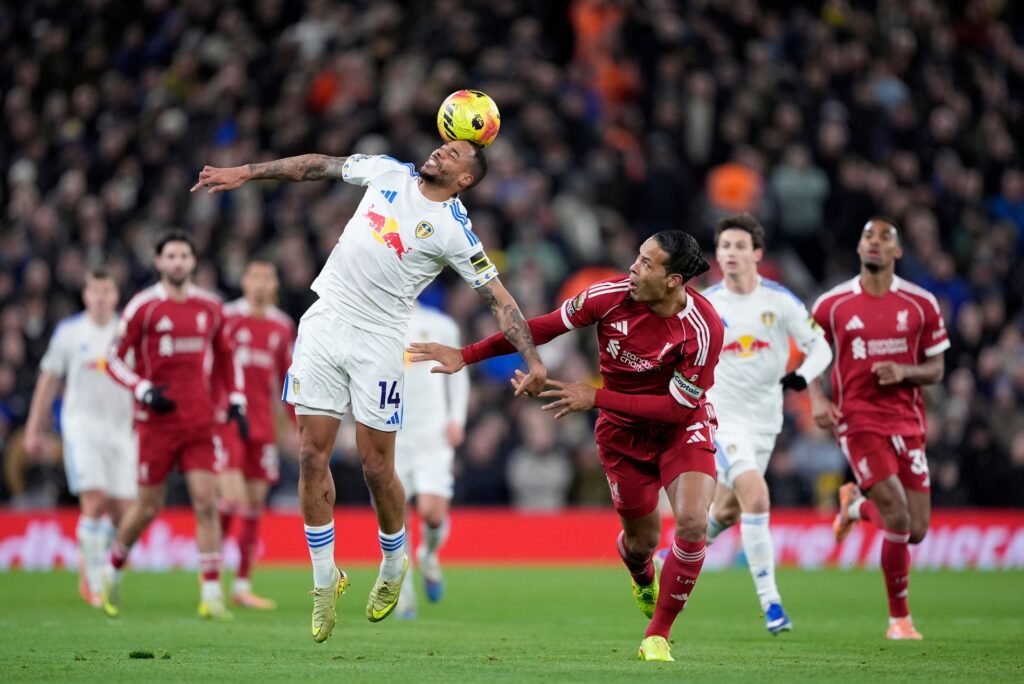 Leeds, now firmly on the back foot, were almost caught out by Ibrahima Konaté’s long ball over the top. Ekitiké sprinted clear of central defender Bijol, who responded by holding the forward as he advanced into the area. Ekitiké stayed on his feet and squared to Wirtz, who was denied by another important challenge from Justin. The lively striker’s appeals for a penalty kick were dismissed by the referee, Chris Kavanagh.